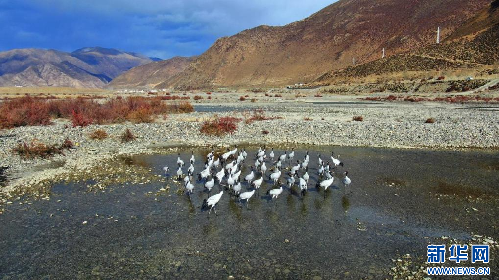 圖為岸邊的黑頸鶴(11月24日攝)。新華網(wǎng)發(fā) 嘎色攝  ??