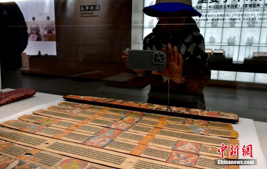 以“見證與守望——鑄牢中華民族共同體意識主題展”為主題的展覽近日亮相西藏自治區(qū)拉薩市布達拉宮雪城珍寶館。本次主題展精選100余件文物珍品,展覽通過文物、古籍及布達拉宮的傳承與發(fā)展,講述各民族交往交流交融的故事。圖為1月2日,觀眾拍攝展覽中的13世紀(jì)《般若八千頌》貝葉經(jīng)寫本。中新社記者 李林 攝