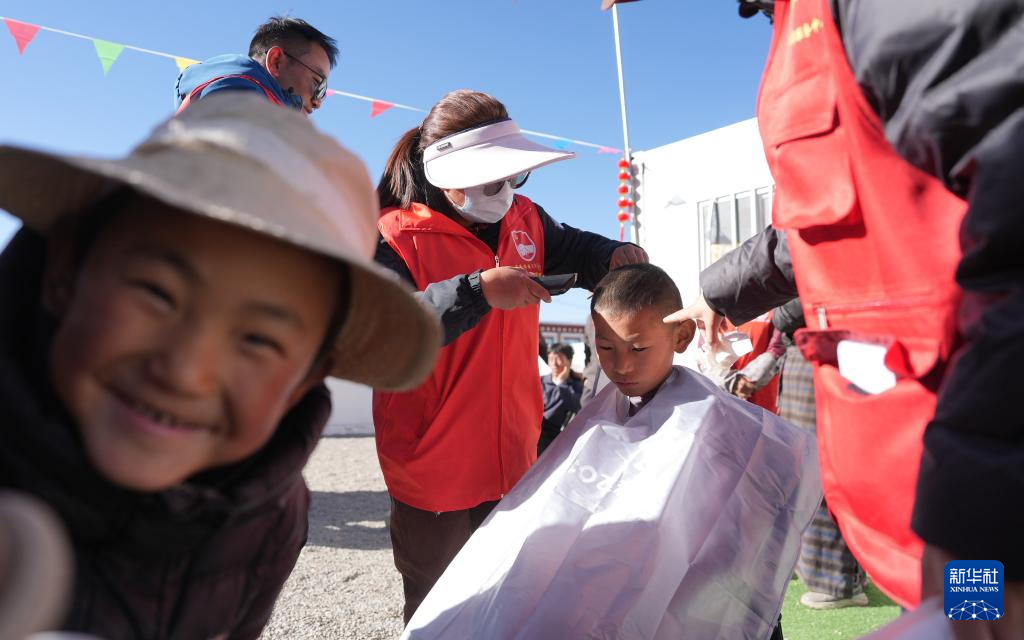 1月26日,志愿者在拉孜縣吉如村安置點(diǎn)給孩子們理發(fā)。新華社記者 晉美多吉 攝?