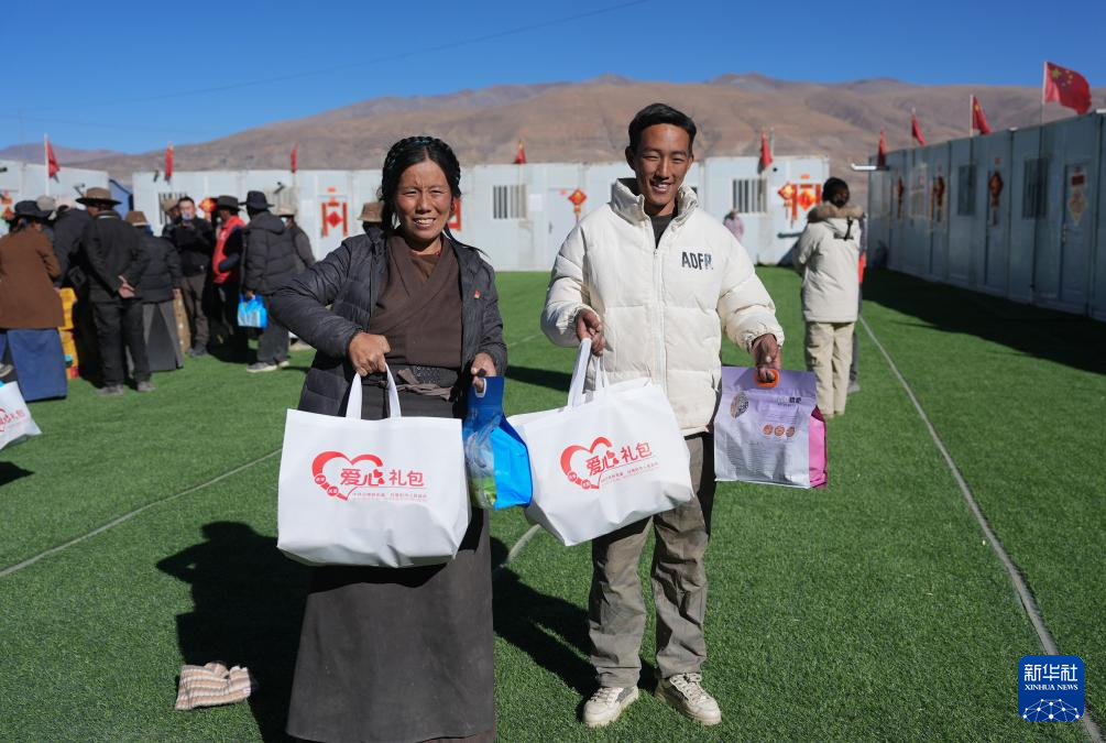1月27日,拉孜縣加嘎村安置點(diǎn)受災(zāi)群眾領(lǐng)到新年大禮包。新華社記者 晉美多吉 攝?