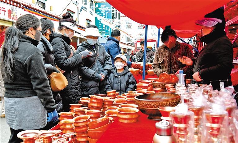 圖為市民群眾在年貨市場(chǎng)購(gòu)買藏式木碗。記者 曲珍 攝