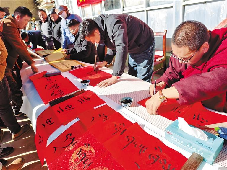 藏歷新年來臨之際,浪卡子縣浪卡子鎮(zhèn)農(nóng)牧民群眾齊聚一堂,舉行“蛇年新篇再起航 攜手并肩共奮斗”迎新年活動(dòng)?;顒?dòng)現(xiàn)場(chǎng),書法愛好者潑墨揮毫,根據(jù)群眾的需求,將對(duì)新年的美好祝愿融入一幅幅精美的春聯(lián)之中。