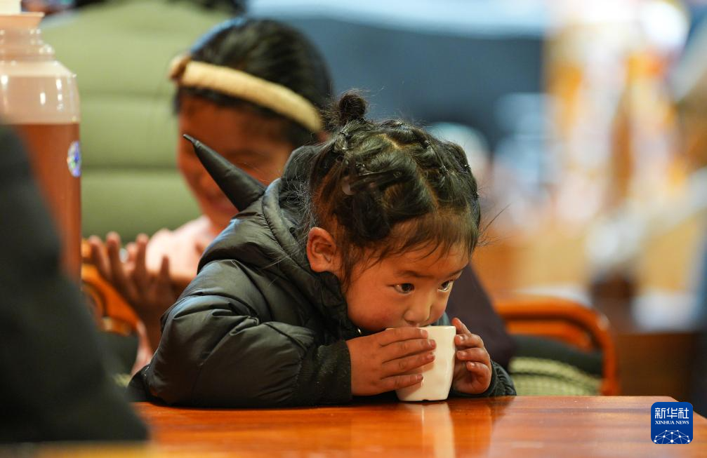 小顧客在“牧人寶庫”藏式茶館喝酥油茶(2月13日攝)。新華社記者 晉美多吉 攝?