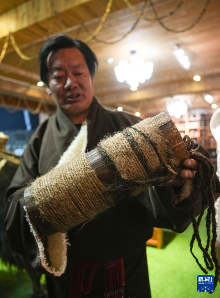 “牧人寶庫”藏式茶館主人珠珠演示紡羊毛線用的工具(2月13日攝)。新華社記者 晉美多吉 攝