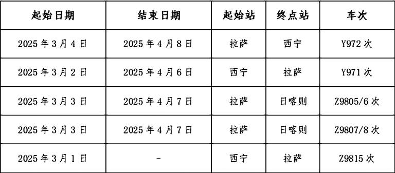 2月19日,記者從拉薩火車站獲悉,2025年3月4日至4月8日,拉薩至西寧間加開Y972次臨時旅客列車。2025年3月2日至4月6日,西寧至拉薩間加開Y971次臨時旅客列車。2025年3月3日至4月7日,拉薩至日喀則間加開Z9805/6、Z9807/8次臨時旅客列車。2025年3月1日,西寧至拉薩間加開Z9815次旅客列車。望廣大旅客周知!