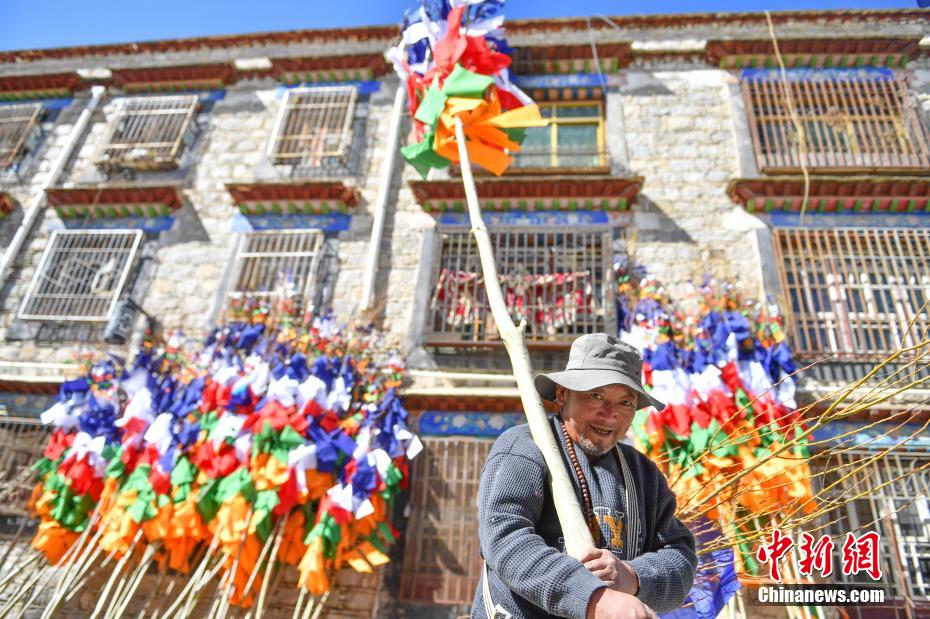 臨近藏歷新年,2月16日,在西藏拉薩街頭,農(nóng)牧民正縫制五彩經(jīng)幡樹。五彩經(jīng)幡樹是藏族民眾在藏歷新年前必備的年貨之一。藏歷新年期間,藏族民眾會選擇一個良辰吉日,為自家的房頂更換五彩經(jīng)幡樹,祈求新的一年里五谷豐登,吉祥如意。圖為2月16日,頓珠扛著五彩經(jīng)幡樹。貢確 攝