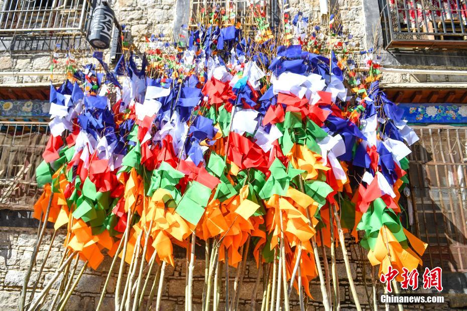臨近藏歷新年,2月16日,在西藏拉薩街頭,農(nóng)牧民正縫制五彩經(jīng)幡樹。五彩經(jīng)幡樹是藏族民眾在藏歷新年前必備的年貨之一。藏歷新年期間,藏族民眾會選擇一個良辰吉日,為自家的房頂更換五彩經(jīng)幡樹,祈求新的一年里五谷豐登,吉祥如意。圖為2月16日,制作完成的五彩經(jīng)幡樹。貢確 攝