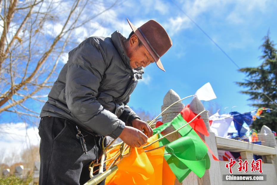 臨近藏歷新年,2月16日,在西藏拉薩街頭,農(nóng)牧民正縫制五彩經(jīng)幡樹。五彩經(jīng)幡樹是藏族民眾在藏歷新年前必備的年貨之一。藏歷新年期間,藏族民眾會選擇一個良辰吉日,為自家的房頂更換五彩經(jīng)幡樹,祈求新的一年里五谷豐登,吉祥如意。圖為2月16日,頓珠正在縫制五彩經(jīng)幡樹。貢確 攝