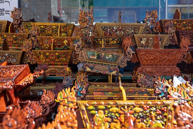 “老板,這個切瑪盒多少錢?便宜點我就拿走了?!薄斑@個圖案樣式都是精心雕刻的,最低1300元,實在不能再少了?!贝稳实牡赇伹埃簧兕櫩驼谔暨x“切瑪盒”,生意很是火爆?!扒鞋敽小笔菍⒕贫沸文竞杏酶舭宸珠_,左右兩邊分別盛入炒青稞和糌粑,再插上象征五谷豐登的“羅薩梅朵”和寓意吉祥的酥油花,寓意人壽年豐、吉祥如意,是藏歷新年家家戶戶必備的年貨之一。次仁告訴記者,“切瑪盒”根據(jù)圖案、顏料、大小、木材等因素,售價從幾百元到上千元不等,很多顧客普遍喜愛傳統(tǒng)樣式與圖案。