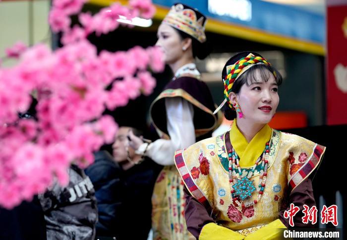 圖為西藏林芝第二十二屆桃花旅游文化節(jié)推介會(huì)(拉薩站)現(xiàn)場(chǎng),身著藏裝的工作人員。李林 攝