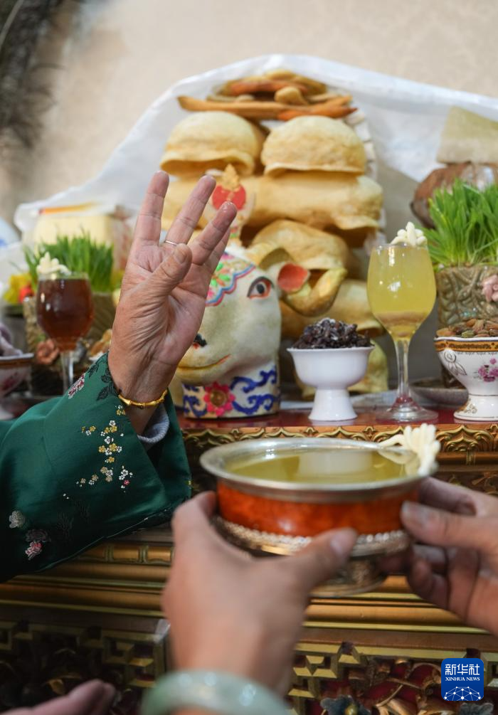 2月28日,身著藏裝的拉薩市民在吃寓意五谷豐登的“切瑪”。新華社記者 晉美多吉 攝??