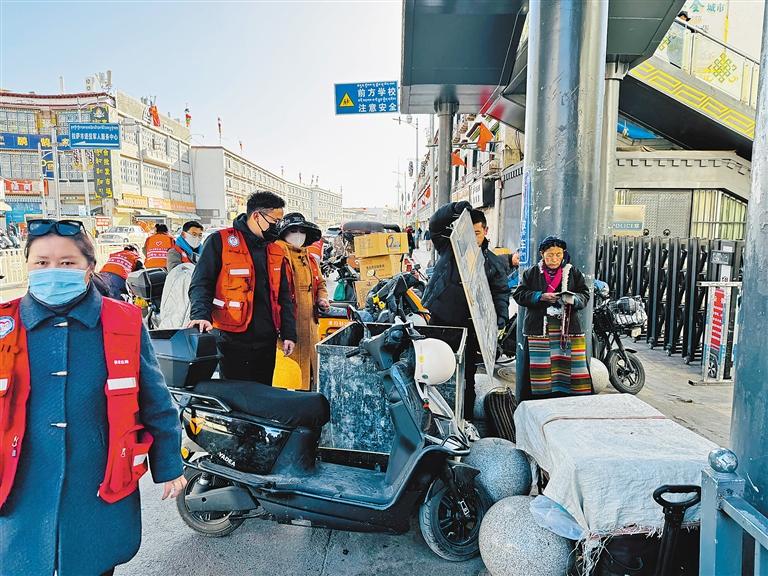 圖沖賽康社區(qū)全體工作人員及駐居工作隊(duì),開展非機(jī)動(dòng)車亂停亂放專項(xiàng)整治行動(dòng)。 記者 央金 攝