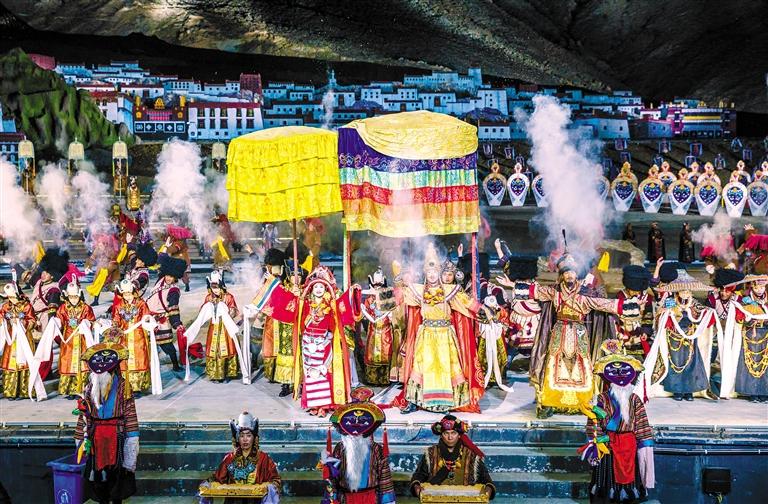 《文成公主》大型實景劇以文成公主入藏為主題,以鑄牢中華民族共同體意識為根本遵循,講述文成公主與松贊干布聯(lián)姻、促進民族融合發(fā)展的故事,展現(xiàn)新時代新西藏的獨特魅力和繁榮景象。12年來,該劇累計演出2100多場,演出及園區(qū)旅游配套累計接待觀眾游客超3200萬人次,為當(dāng)?shù)厝罕姲l(fā)放薪資超5億元。