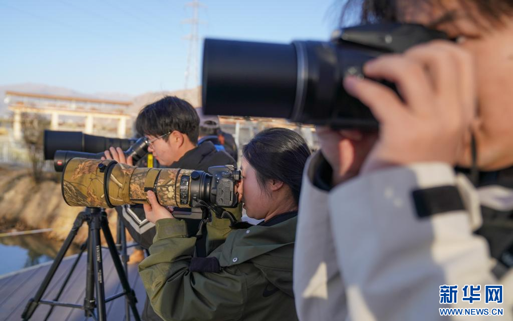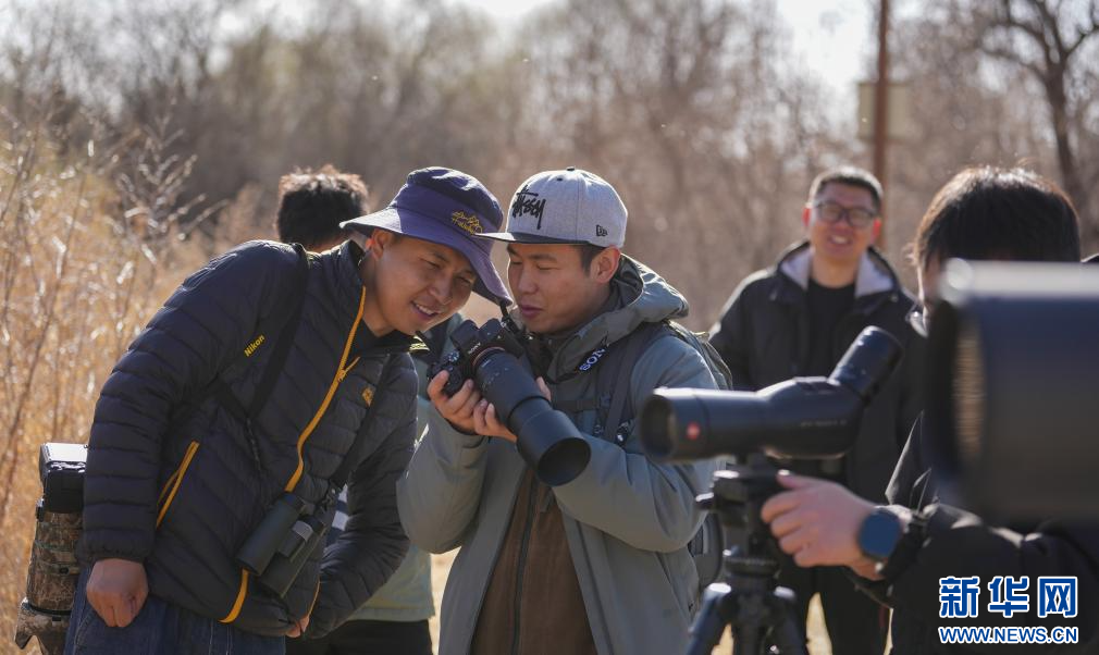 3月29日,參加采風活動的成員在拉魯濕地觀鳥拍照。(新華社記者 晉美多吉 攝)