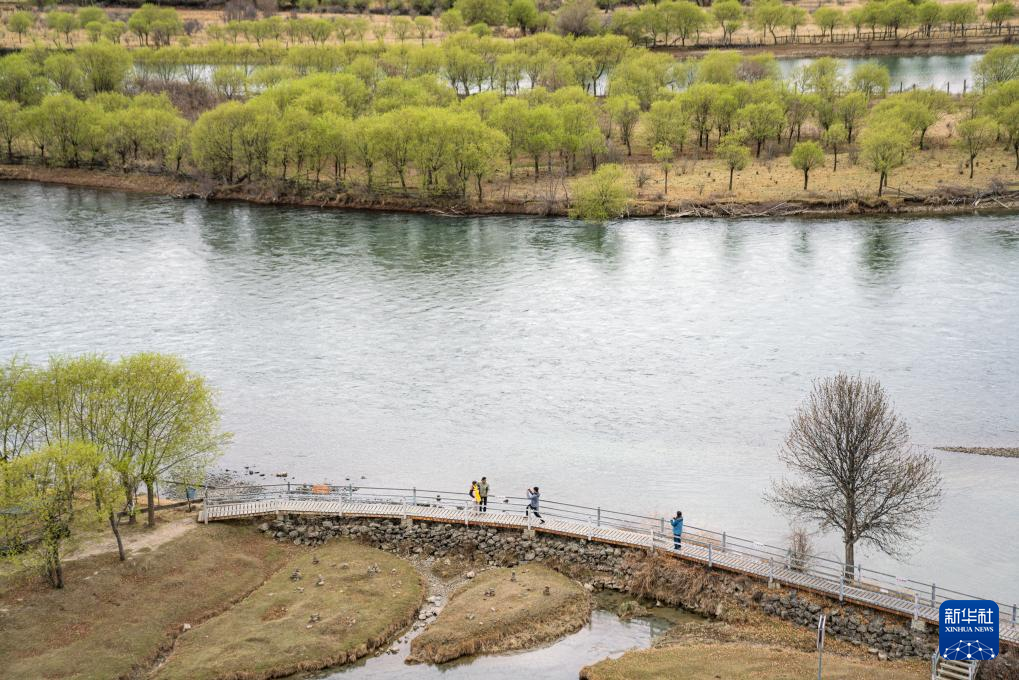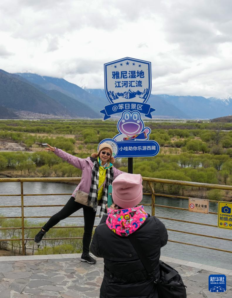 4月4日,游客在雅尼國家濕地公園觀景臺(tái)拍照打卡。新華社記者 晉美多吉 攝?
