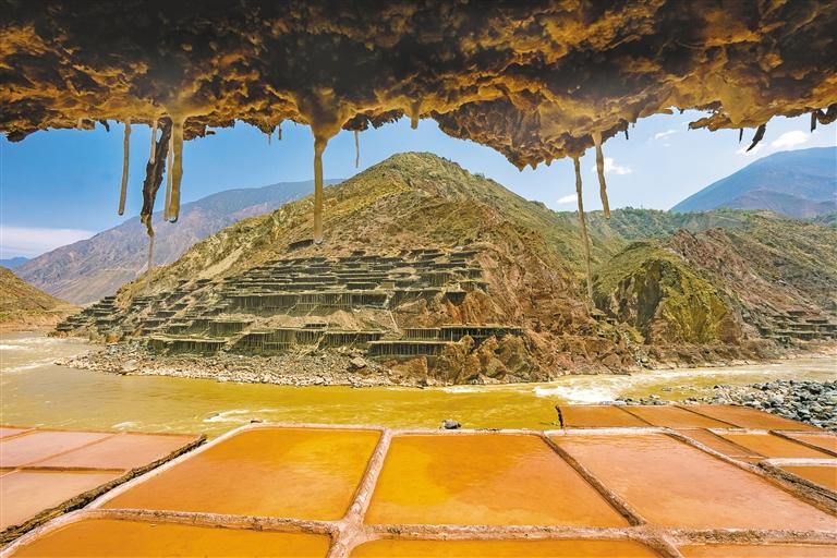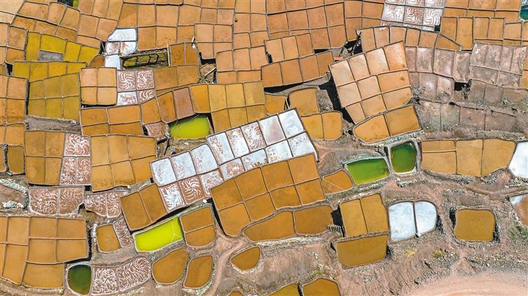 鹽田里,60歲的乃柯正和丈夫一起用木拍夯實鹽田。“現在用泵抽水輕松多了,但拍鹽田的手藝不能丟?!崩先说脑捳Z中,既有對科技的接納,也有對傳統(tǒng)的堅守。鹽田下方,鹽晶垂落成簾,在山風拂動下閃爍微光,仿佛在訴說著什么。一塊塊鹽田如同一面面鏡子,既映照出千年文明的厚重,也折射著鄉(xiāng)村振興的希望。當鹽民們輕掃鹽田,他們掃的不僅是晶瑩的鹽,更是一份在傳承與創(chuàng)新中守護的鄉(xiāng)愁。 圖/記者 阿旺尼瑪