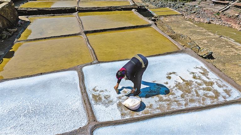 傳承千年的制鹽技術,就是從鹽井汲取鹵水倒入貯鹵池存放5到6天,將貯鹵池中的鹵水灌注到鹽田中,依靠風吹日曬析出鹽粒。而后,將結晶的鹽刮成弧形以充分脫水。每年的11月至次年6月為曬鹽季,其中3月到5月為旺季。收鹽的周期因氣候、地勢而異,平均3到5天收一次鹽。收鹽一般分兩道工序,第一道用薄木板或薄鐵片刮取最上層的鹽,這道鹽雜質少,色澤干凈,為食用白鹽;第二道鹽因在刮取時會不可避免地混入泥土,無法食用,通常為養(yǎng)生紅鹽,也有部分會用于牲畜飼料制作。