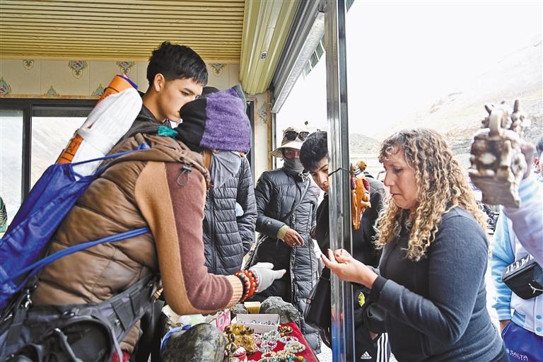新奇感過(guò)后,游客們開(kāi)啟購(gòu)物模式?!鞍⒓眩@個(gè)掛飾可以定制嗎?”“你們可以發(fā)快遞嗎?”對(duì)于一連串的問(wèn)題,阿佳格桑忙碌地一一回答著,“你們想要什么圖形,我們就給你定制什么圖形?!薄拔覀冞@兒快遞很快,今天下單明天就給你發(fā)!”短短半個(gè)小時(shí),“阿佳格桑工坊”的生意火爆,銷售藏式靠墊、藏式地毯、掛飾等特色產(chǎn)品4000多元?!盎厝ズ?,我要通過(guò)自媒體平臺(tái),宣傳這次西藏之旅的所見(jiàn)所聞,讓更多親朋好友來(lái)西藏旅游!”日本游客琴音有感而發(fā)。