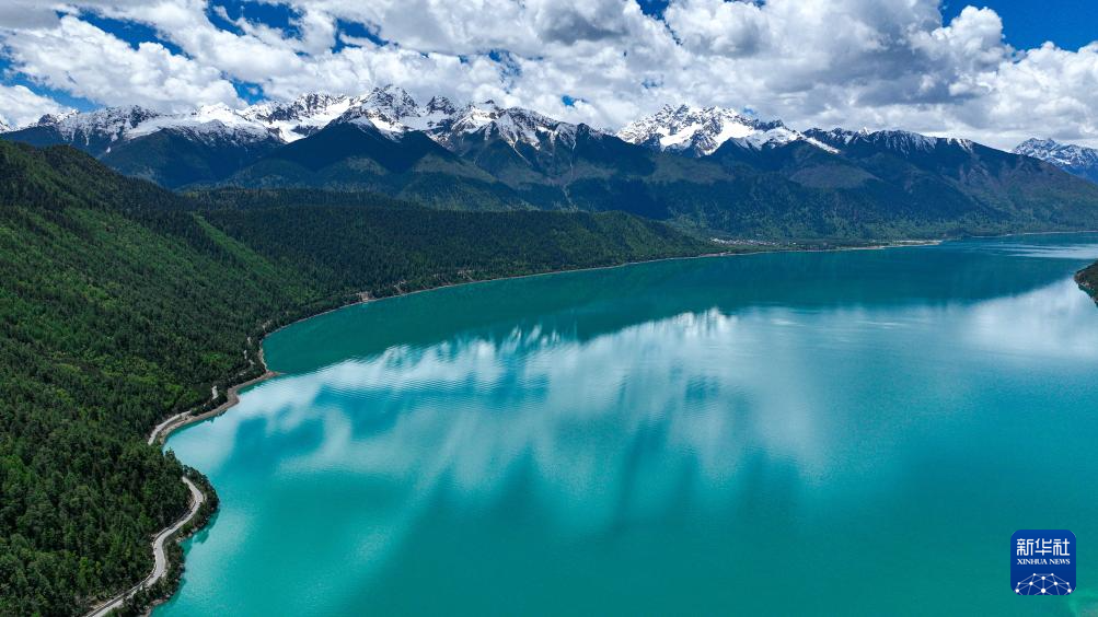雪山環(huán)抱的巴松措(5月28日攝,無人機(jī)照片)。新華社記者 晉美多吉 攝 ??