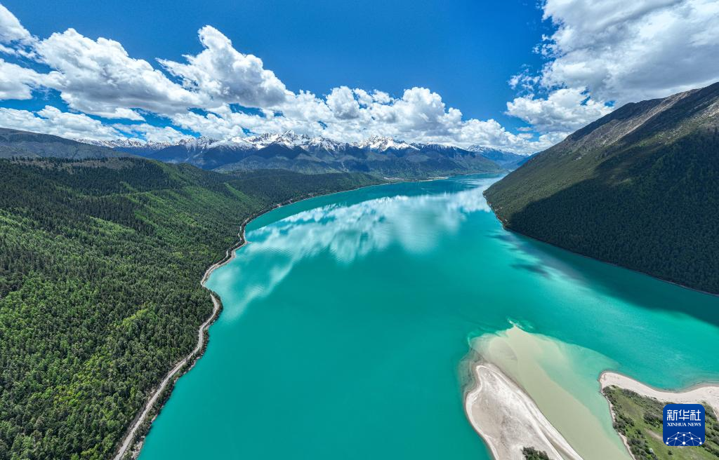 巴松措岸邊蜿蜒的公路(5月28日攝,無人機(jī)照片)。新華社記者 晉美多吉 攝