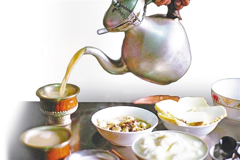 人們平常吃的早餐有粥、包子、豆?jié){、面條等,而在高原地區(qū),糌粑和酥油茶是當?shù)厝说臓I養(yǎng)早餐,也是藏族人餐桌上的必選。其中,酥油茶是為適應(yīng)高寒環(huán)境而創(chuàng)造的特色飲品。它是將牦牛奶提煉的酥油與磚茶湯混合,加入鹽調(diào)味制成的,口感濃郁醇厚。其高脂肪、高熱量的特性,既能抵御嚴寒,又可緩解高原缺氧帶來的疲勞,既是當?shù)厝说脑绮?,也是日常生活中的必需品?/p>
