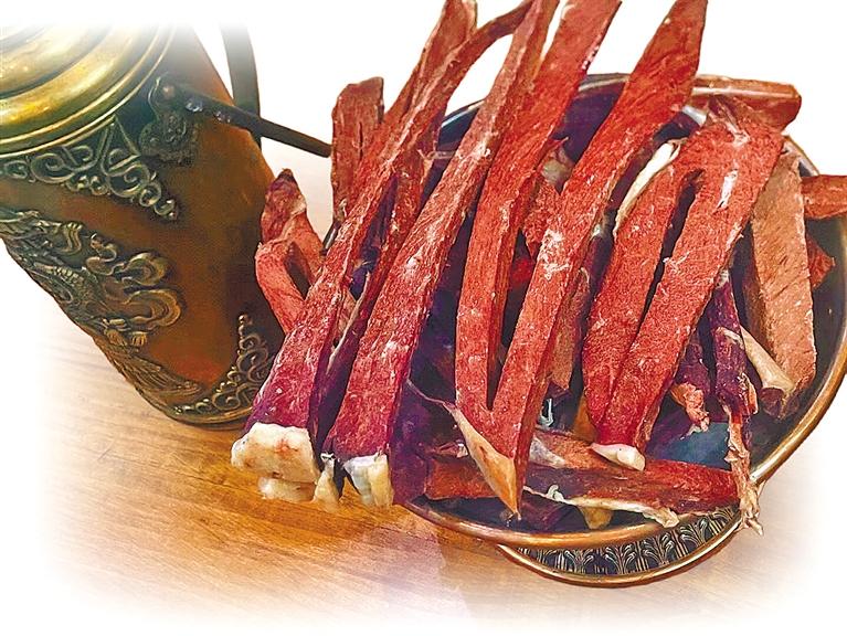 在高原,人們還熱衷于原汁原味的零食,風干牦牛肉是藏族人民的冬季寶藏零食。風干牛肉必須在嚴寒的冬季制作才能保留其原汁原味,牦牛的后腿或里脊肉最適合做風干牛肉。把肉切成粗條,用鹽巴或花椒、辣椒等香料揉搓,懸掛在陰涼的通風處,高原的嚴寒和干燥的空氣促使牛肉自然風干。這樣做出的肉干嚼勁十足,是真正的高原蛋白質(zhì),也是藏族人待客的首選美味。