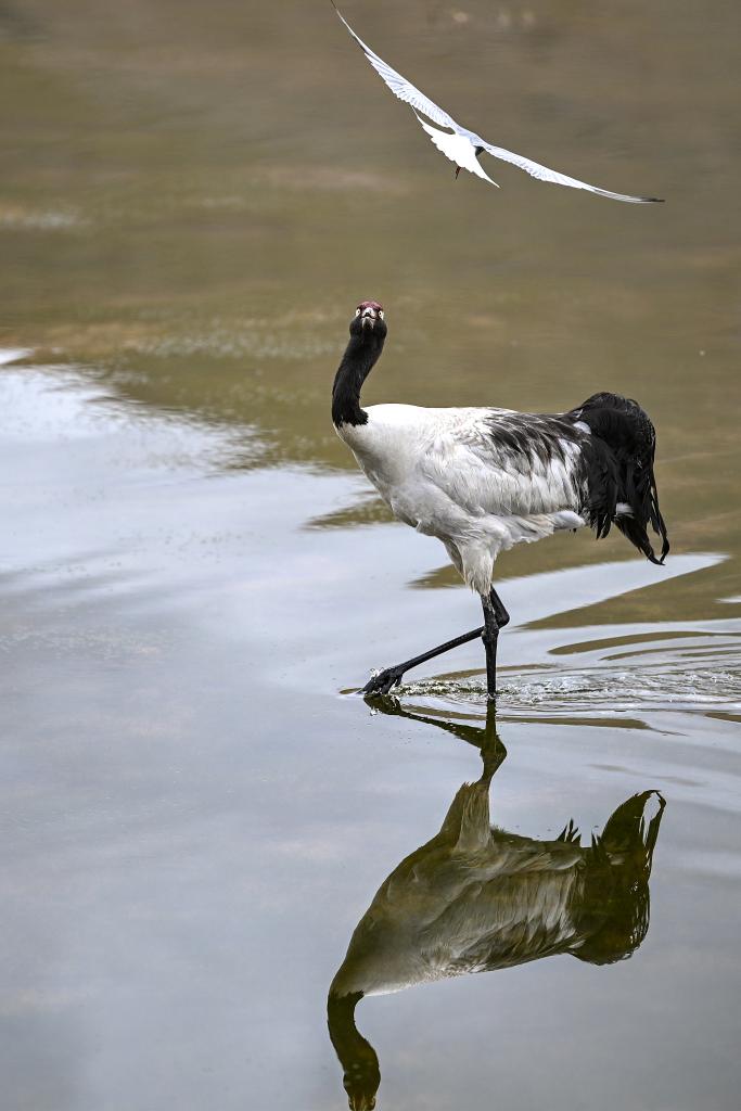 在西藏那曲市申扎縣,一只黑頸鶴試圖驅趕鳥巢附近活動的漁鷗(2025年6月4日攝)。新華社記者 孫瑞博 攝