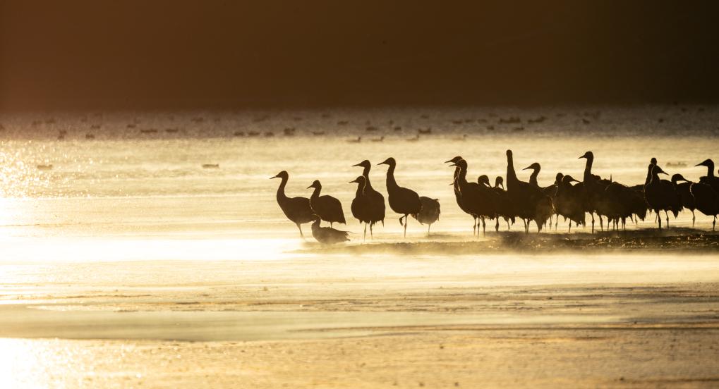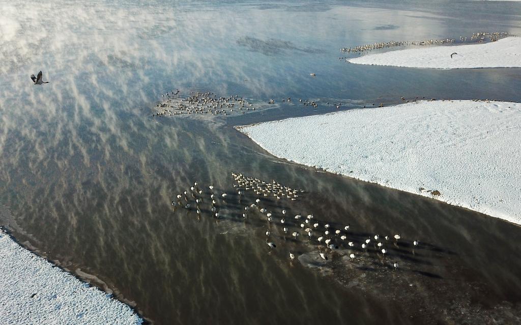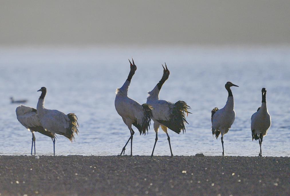 這是清晨在拉薩市林周縣虎頭山水庫拍攝的越冬黑頸鶴。西藏拉薩市林周縣位于拉薩河上游及澎波河流域,平均海拔約4200米,是黑頸鶴主要的越冬地之一(2023年12月5日攝)。新華社記者 姜帆 攝