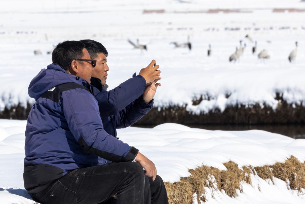 當雄縣野生動物疫源疫病監(jiān)測員尼瑪頓珠(左)和同事扎西頓珠在雪后的阿熱濕地觀察遷徙途中的黑頸鶴(2024年4月7日攝)。 新華社記者 姜帆 攝
