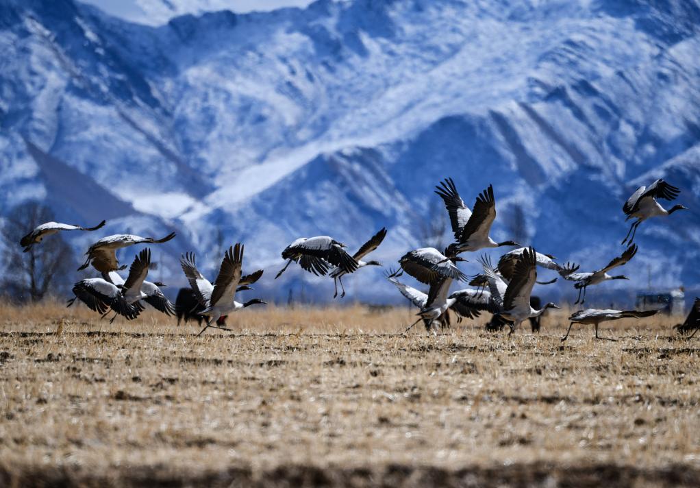 在拉薩市林周縣境內越冬的黑頸鶴(2022年2月22日攝)。新華社記者 覺果 攝