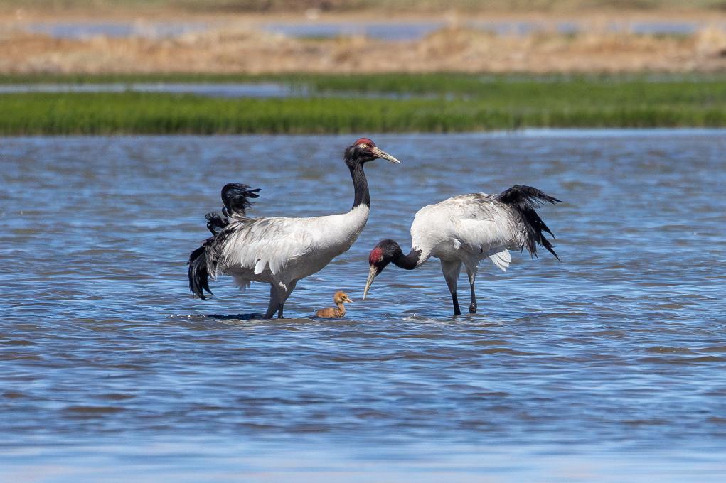 一對黑頸鶴在那曲市申扎縣的濕地上“換班”照顧剛出殼的雛鳥(2025年6月4日攝)。 新華社記者 姜帆 攝