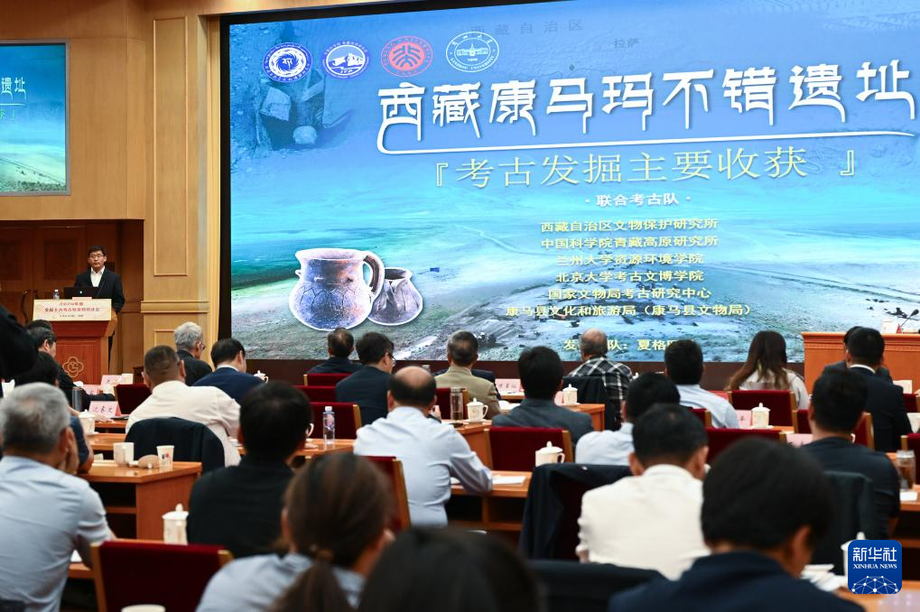 4月23日,聯(lián)合考古隊(duì)領(lǐng)隊(duì)夏格旺堆在“2024年度全國十大考古新發(fā)現(xiàn)”終評(píng)會(huì)現(xiàn)場(chǎng)向?qū)<覍W(xué)者和媒體介紹瑪不錯(cuò)遺址相關(guān)情況。新華社記者 李賀 攝 ??