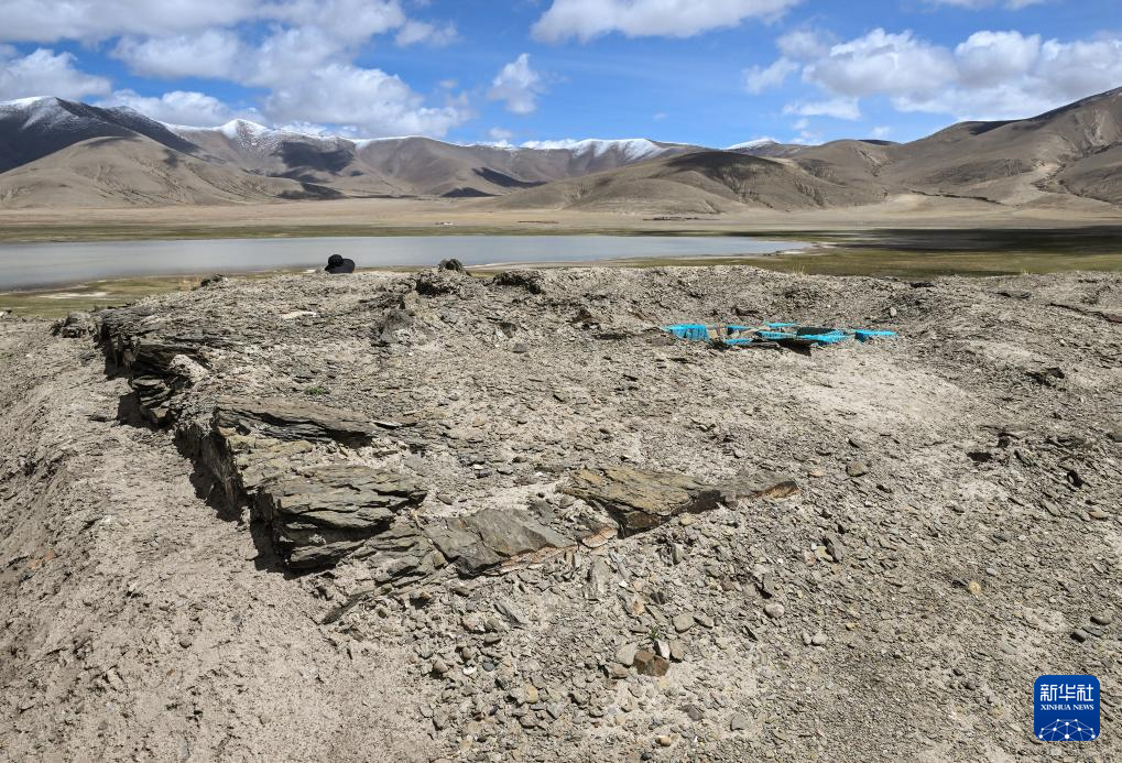 這是5月22日拍攝的坐落在瑪不錯(cuò)湖畔的遺址第四期石構(gòu)地面建筑考古發(fā)掘現(xiàn)場(chǎng)(無人機(jī)照片)。新華社記者 李賀 攝 ??