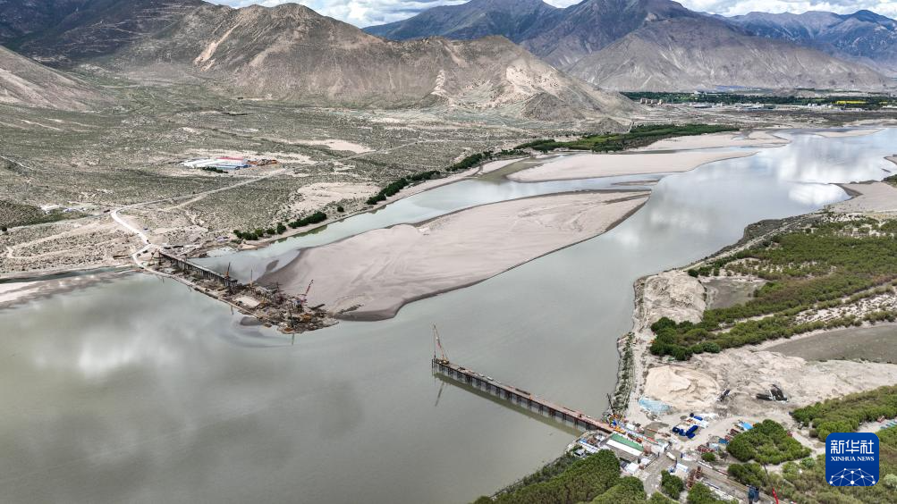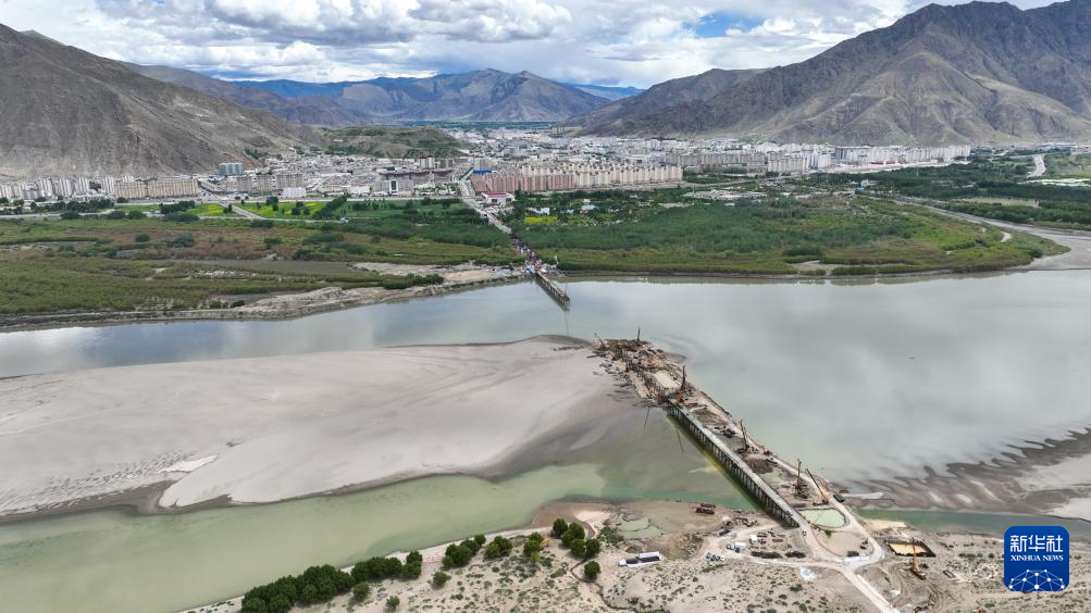 建設(shè)中的薩熱路跨江大橋(6月18日攝,無人機(jī)照片)。新華社記者 晉美多吉 攝