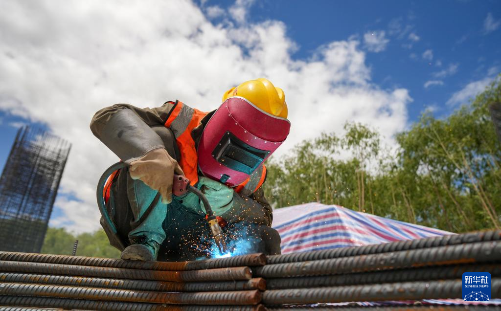 工人在薩熱路跨江大橋建設(shè)現(xiàn)場焊接鋼筋(6月18日攝)。新華社記者 晉美多吉 攝 ??