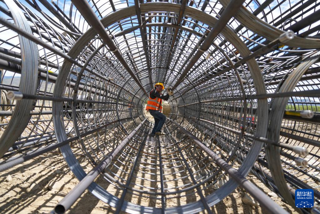 工人在薩熱路跨江大橋建設(shè)現(xiàn)場綁扎聲測管(6月18日攝)。新華社記者 晉美多吉 攝 ??