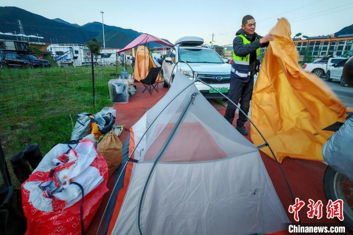 6月26日,摩旅理發(fā)師李秋實(shí)到達(dá)西藏林芝宇拓公園自駕露營(yíng)地,搭建帳篷準(zhǔn)備過夜。中新社記者 江飛波 攝