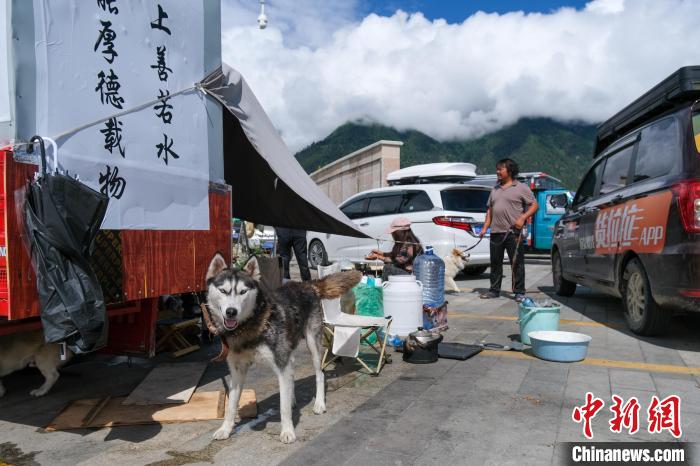 6月29日,西藏林芝宇拓公園自駕露營(yíng)地的哈士奇,它跟隨主人乘電動(dòng)三輪車進(jìn)藏。中新社記者 江飛波 攝