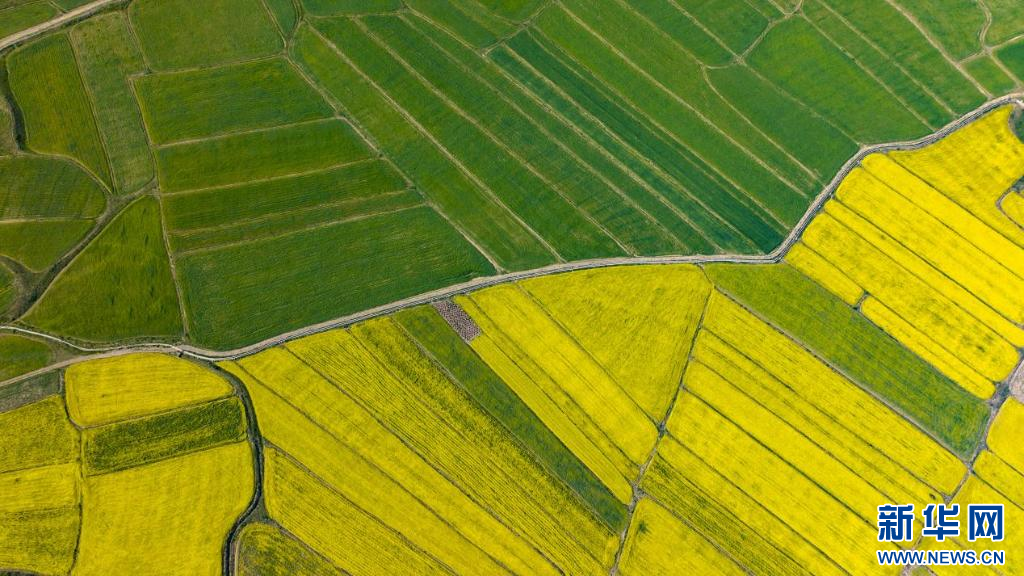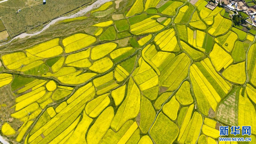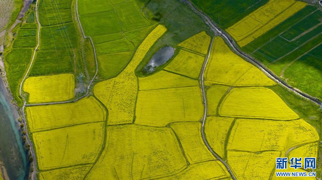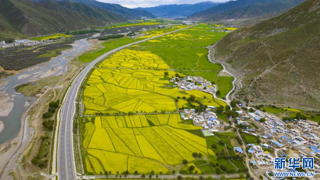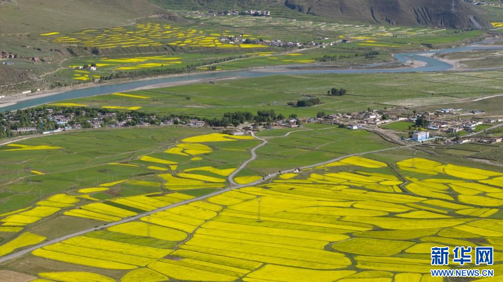 圖為7月2日拍攝的俯瞰墨竹工卡縣扎西崗鄉(xiāng)加爾多村油菜花田(無人機照片)。新華網(wǎng)發(fā) 洛克 攝