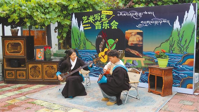 在音樂鑒賞環(huán)節(jié),拓崗扎念樂隊將傳統(tǒng)扎念琴演奏與現(xiàn)代音樂結(jié)合,表演了《卓木仁青崗》等曲目;青年歌手次仁羅布演唱藏族民歌,展現(xiàn)非遺特色。在藝術(shù)對談中,青年畫家雍忠卓瑪分享了自己克服身體障礙堅持創(chuàng)作的經(jīng)歷,圍繞“自然與藝術(shù)的關(guān)系”展開討論,結(jié)合作品從藏族文化和鄉(xiāng)土景觀中獲取創(chuàng)作靈感的過程。在寫生體驗環(huán)節(jié),活動參與者以德慶鎮(zhèn)民居和周邊自然景色為素材進行創(chuàng)作,雍忠卓瑪從構(gòu)圖、色彩運用等方面給予指導(dǎo),幫助活動參與者完成10余幅繪畫作品。