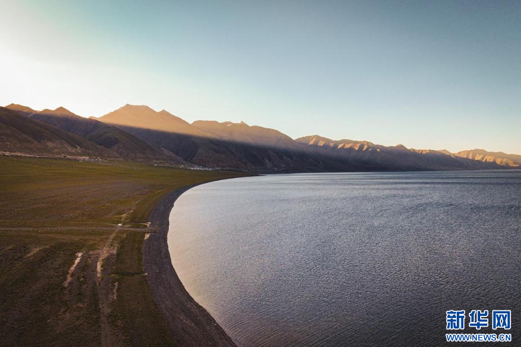 圖為夕陽下的當(dāng)惹雍錯( 7月5日攝,無人機(jī)照片)。新華網(wǎng)發(fā) 車宇軒 攝