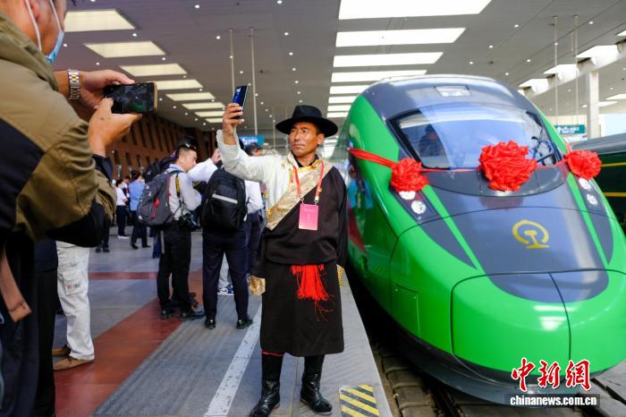 資料圖為2021年6月25日,西藏拉林鐵路開(kāi)通運(yùn)營(yíng),民眾在拉薩火車(chē)站與復(fù)興號(hào)拍照留念。當(dāng)日,斯朗旺扎系首發(fā)司機(jī)。中新網(wǎng)記者 江飛波 攝
