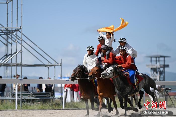 8月13日,九色甘南香巴拉·瑪曲第十六屆格薩爾賽馬會在甘肅甘南藏族自治州瑪曲縣格薩爾賽馬中心開幕。來自貴州、西藏、青海、四川、甘肅等省區(qū)的45支參賽隊962匹駿馬在瑪曲草原上展開為期5天的角逐。圖為開幕式現(xiàn)場馬術(shù)表演。中新社記者 九美旦增 攝