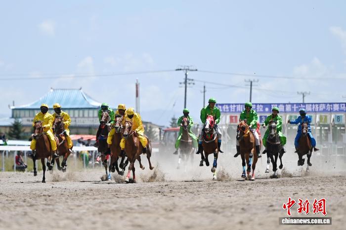 圖為賽馬選手在格薩爾賽馬中心比賽中。中新社記者 九美旦增 攝