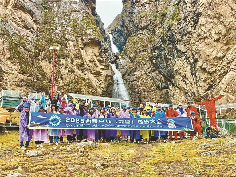 圖為參加西藏戶外(露營(yíng))徒步大會(huì)的戶外徒步愛(ài)好者在曲加瀑布前合影。記者 歐珠次仁 攝