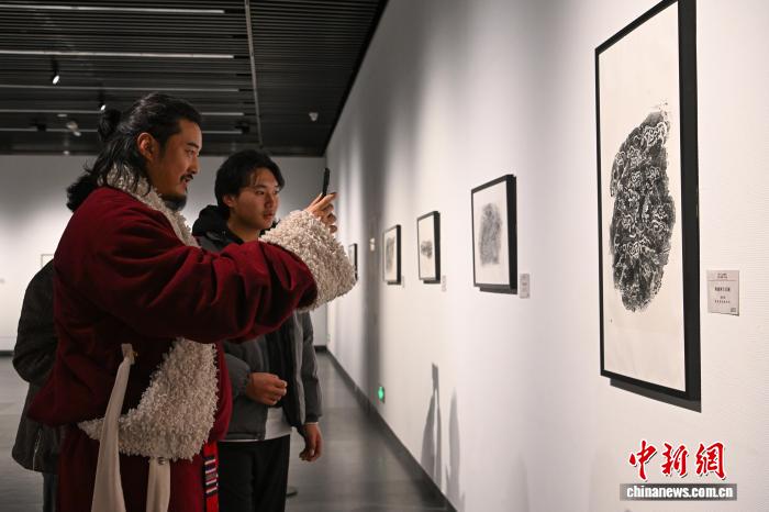 圖為觀眾欣賞展覽中的巖畫石刻拓片作品。中新社記者 貢嘎來松 攝