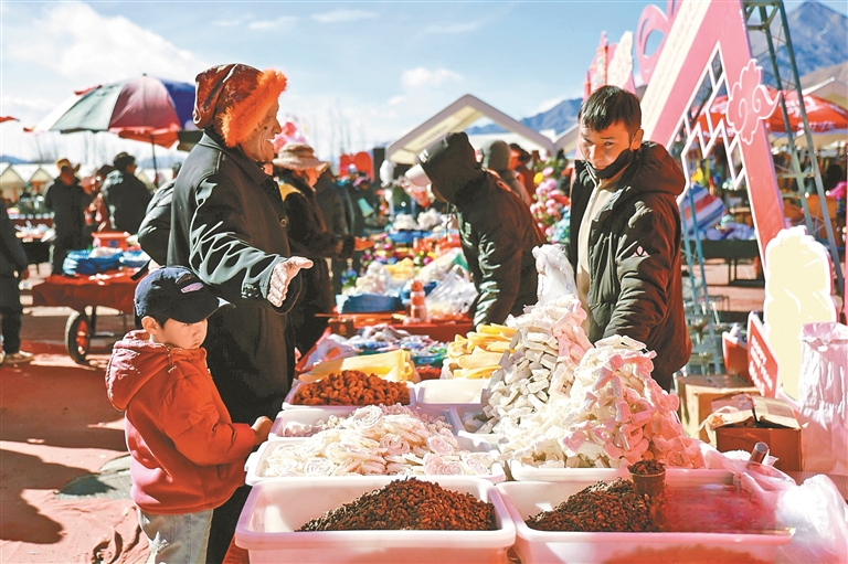 320余個(gè)攤位如繁星般鋪開(kāi),空氣中彌漫著酥油、藏香與干果混合的復(fù)雜香氣。此起彼伏的吆喝聲、討價(jià)還價(jià)聲與孩子們歡快的笑聲交織在一起,為這片集市增添了熱鬧的氣息。短短7天,這場(chǎng)年貨盛會(huì)便吸引客流約13萬(wàn)人次,實(shí)現(xiàn)銷售總額2802萬(wàn)元。這不僅是數(shù)字的躍升,更是“政府搭臺(tái)、商戶獲利、群眾受益”的良性循環(huán)。