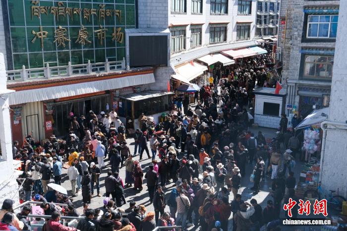2月13日,拉薩傳統(tǒng)年貨市場(chǎng)沖賽康周邊人流如織。中新社記者 江飛波 攝