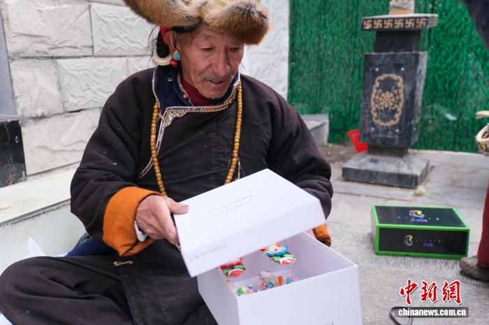 2月13日,拉薩年貨市場(chǎng),來(lái)自日喀則市仁布縣的酥油花手工藝人加布正在打包剛賣(mài)出去的酥油花。中新社記者 江飛波 攝
