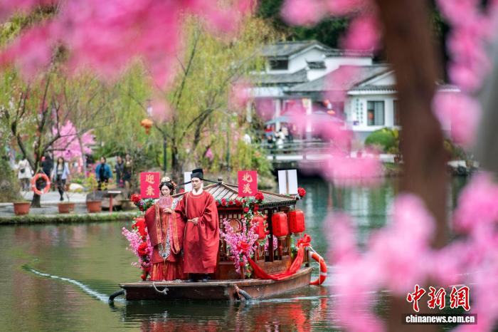 2月27日,第十五屆永春桃花季古風(fēng)姻緣會(huì)系列活動(dòng)在福建永春縣啟動(dòng)。圖為游船上的新人。康慶平 攝